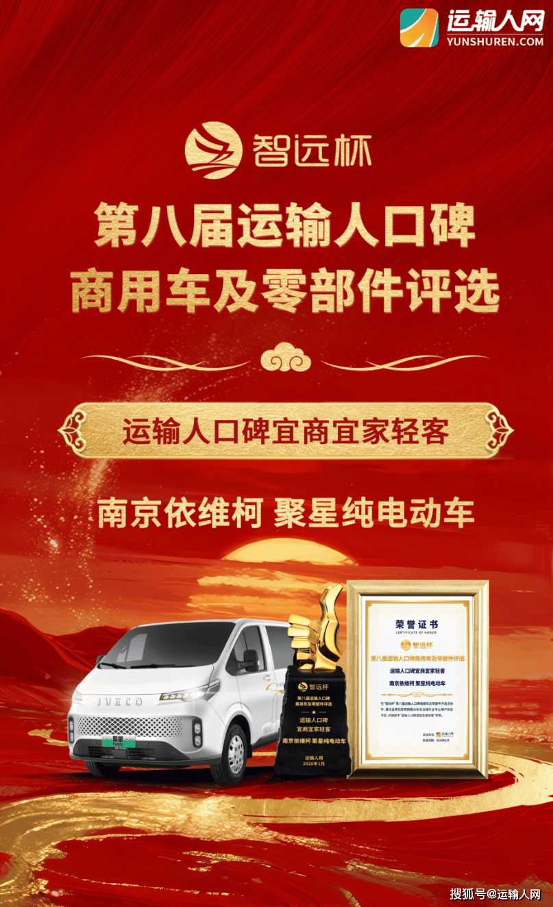 2026年1月16日,运送人网主办的第八届“智远杯”运送人口碑商用车及零部件评选线上颁奖活动隆重举行,南京依维柯聚星纯电动车荣获“运送人口碑宜商宜家轻客”奖项。